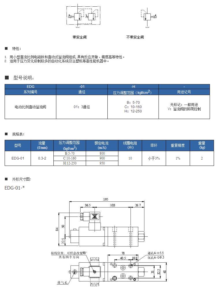 直動式比例電磁溢流閥用小型直流比例電磁鐵和直動式溢流閥組成,具有反應靈敏、精度高等特性。適用于壓力變化級制較多的自動化系統(tǒng)及注塑機等高性能機器中。
