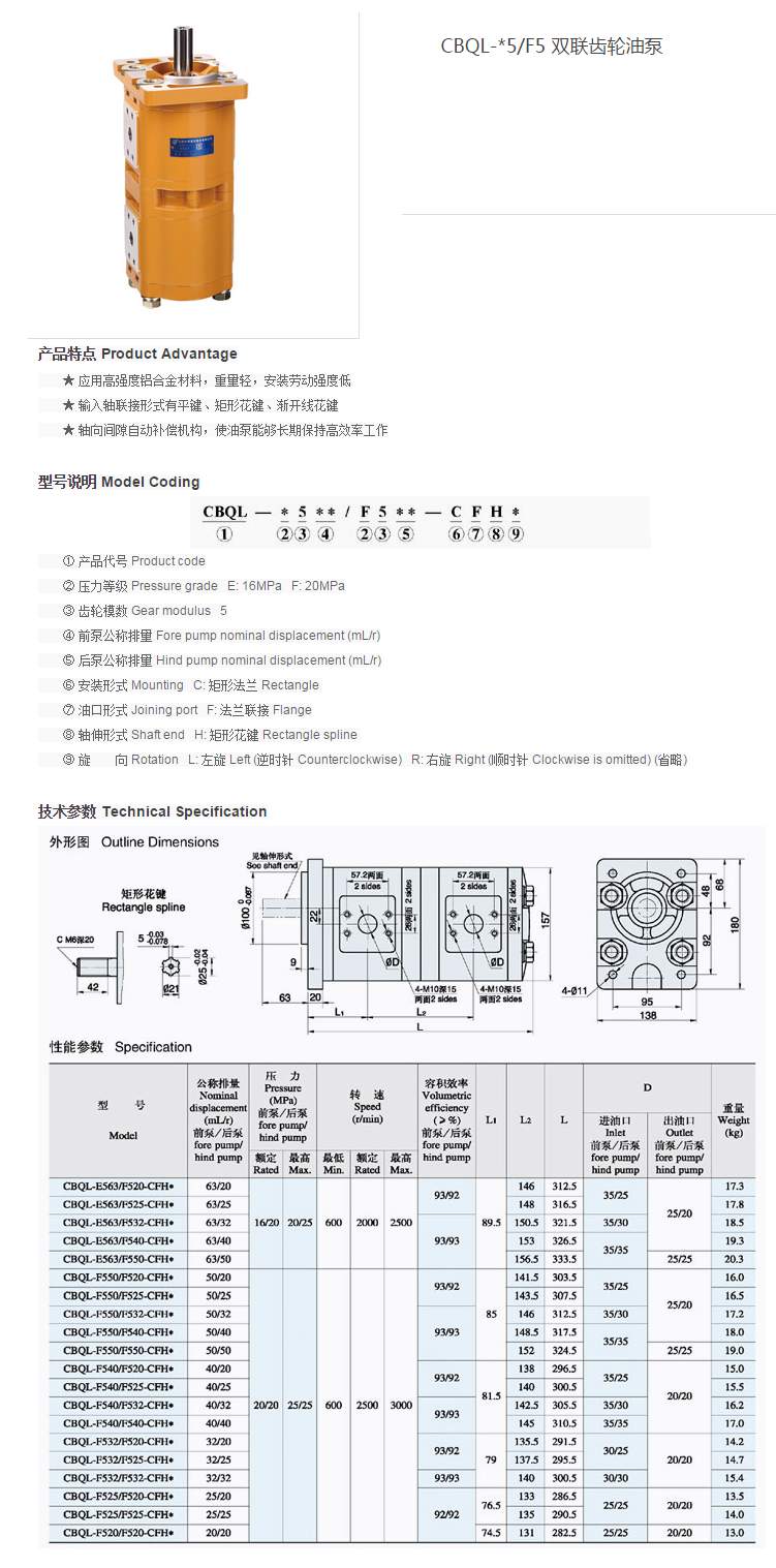 CBQL雙聯(lián)齒輪泵產(chǎn)品特點(diǎn)應(yīng)用高強(qiáng)度鋁合金材料,重量輕,安裝勞動強(qiáng)度低;輸入軸鏈接型式有平鍵、矩形花鍵、漸開線花鍵;軸向間隙自動補(bǔ)償機(jī)構(gòu),使油泵能夠長期保持高效率工作。