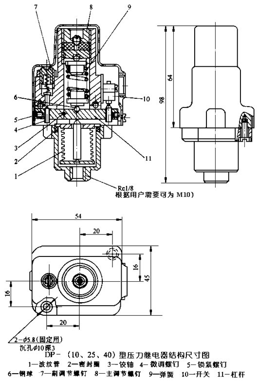 DP-10(A)B壓力繼電器(天津市液壓件廠) DP-10(A)B壓力繼電器由天津液壓件廠生產(chǎn),為壓力控制元件,用于液壓(氣壓)電器,聯(lián)合傳動及精密控制系統(tǒng)中,將液壓(氣壓)之壓力轉(zhuǎn)換為電氣訊號,從而實現(xiàn)自動控制,適用于自動機床、組合機床、內(nèi)燃機車等傳動及控制系統(tǒng)中。 DP-10(A)B壓力繼電器是一種壓力控制元件。用于液壓(氣壓)-電器聯(lián)合傳動及控制的液壓(氣壓)系統(tǒng)中,它是將液壓(氣壓)系統(tǒng)中要求的壓力信號轉(zhuǎn)變?yōu)殡姎庑盘柕囊环N轉(zhuǎn)換裝置或液(氣)-電聯(lián)鎖裝置。一般可作為各種液(氣)-電及機械聯(lián)合傳動的自動控制元件。廣泛應(yīng)用于機床、機械、機車及自動化設(shè)備。由于能完成液(氣)-電聯(lián)鎖,故也可作為系統(tǒng)的安全保護裝置使用。工作介質(zhì):在10~60℃的中性礦物油及其它不含有機械雜質(zhì),并具有防銹性能的液(氣)體。